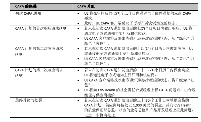 若未能在30個工作日內提交并通過改善及預防計劃(CAPA),供應商將被處以1,000美元的罰金。另外,CVS Health有權根據CAPA流程的結果更改重新審核頻率。